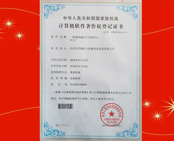 榮獲裝藥器生產控制平臺著作權登記證書